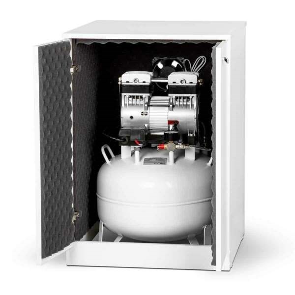 Кожух-тумбочка для стоматологического компрессора изготовлен из ламинированного МДФ белого цвета. Изнутри изделие проклеено шумопоглощающим материалом — пенополиуретаном. Для лучшей циркуляции воздуха внутри размещён вентилятор. Конструкция сборно-разборная, что позволяет существенно сократить транспортные расходы покупателя. Дверцы упрощают доступ к компрессору с целью обслуживания.
