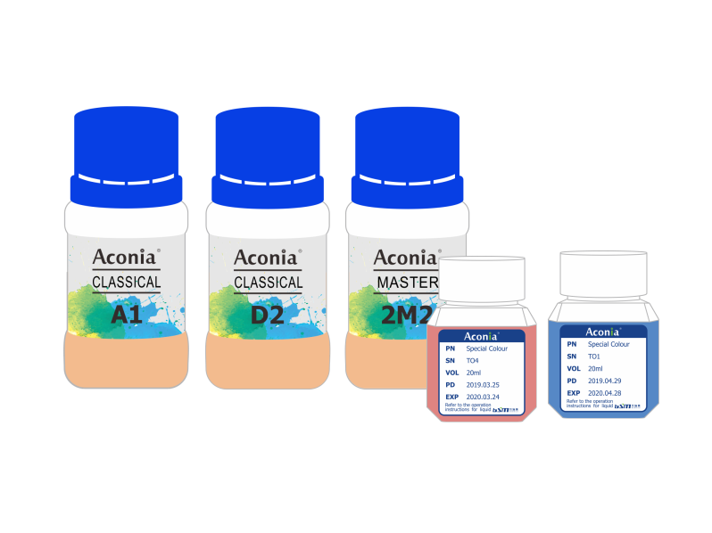 На водной основе. Предназначены для окрашивания не спеченого диоксида циркония. Идеальный результат и точное попадание в оттенок по шкале вита и работе с дисками Aconia HT+.