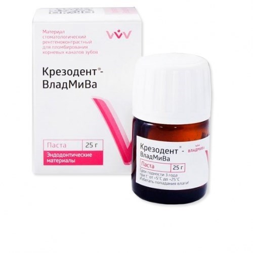 Паста «Крезодент-ВладМиВа» рентгеноконтрастна, легко вводится и полностью заполняет корневой канал. Материал отверждается в течение 24-78 часов, связывая внутриканальную влагу.