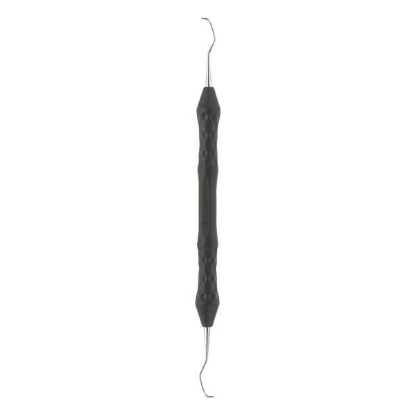 Кюретка стоматологическая по GRACEY, 3/4, DB381R, B.Braun (Aesculap, Германия) предназначена для удаления поддесневого и незначительного наддесневого зубного камня, грануляционных и эпителиальных тканей зубодесневого кармана, размягченных инфицированных элементов зубного цемента. Инструмент состоит из ручки черного цвета, функционального стержня и рабочей части, изготовленной из нержавеющей части. Рабочая часть имеет закругленный кончик, режущие (боковые) края, округлую спинку.