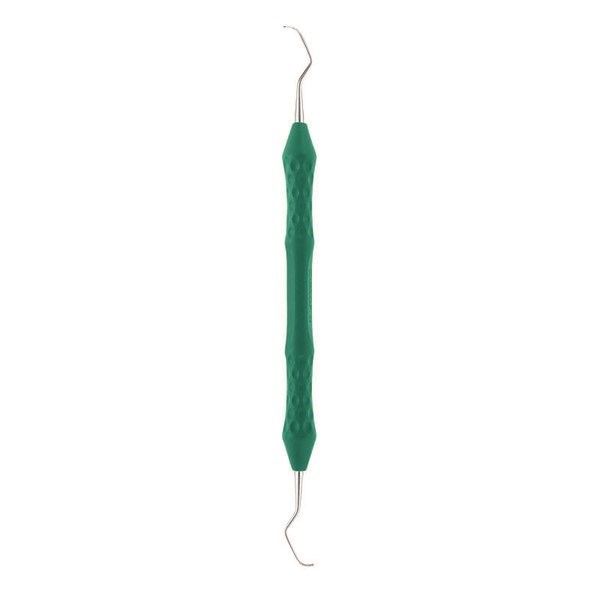 Кюретка стоматологическая, по GRACEY, 7/8, DB383R, B.Braun (Aesculap, Германия) предназначена для удаления поддесневого и незначительного наддесневого зубного камня, грануляционных и эпителиальных тканей зубодесневого кармана, размягченных инфицированных элементов зубного цемента. Инструмент состоит из ручки зеленого цвета, функционального стержня и рабочей части, изготовленной из нержавеющей части. Рабочая часть имеет закругленный кончик, режущие (боковые) края, округлую спинку.
