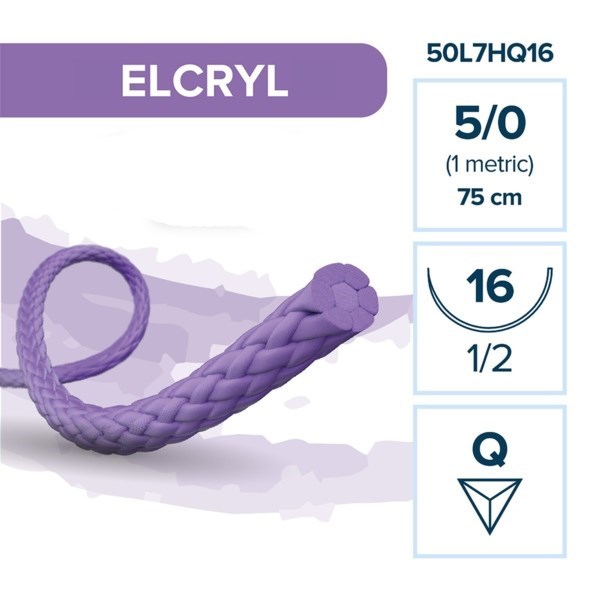 Шовный материал ELCRYL — это рассасывающаяся плетеная хирургическая нить, состоящая из сополимера гликолида с L-лактидом (в соотношении 90:10), покрыта компонентом того же состава в сочетании со стеаратом кальция. Имеет предсказуемые средние сроки рассасывания, держит узел от 18 до 21 дня, полностью абсорбируется за счет гидролиза через 50-70 дней.