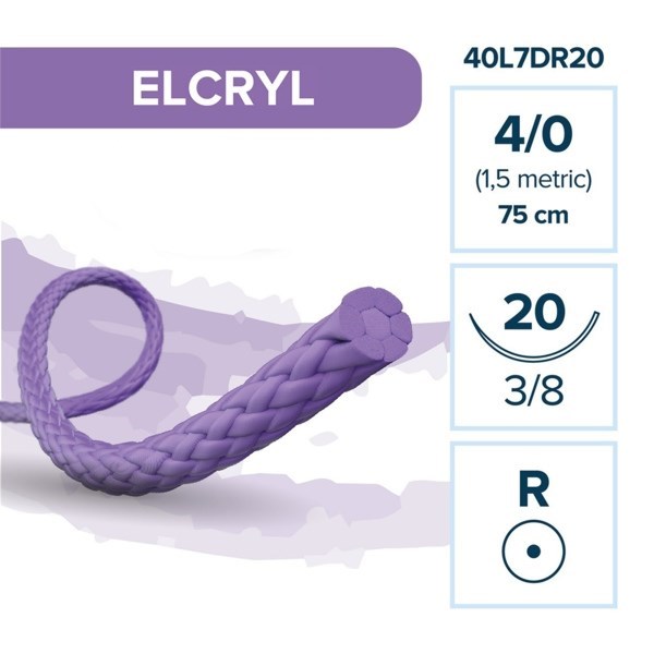 Шовный материал ELCRYL — это рассасывающаяся плетеная хирургическая нить, состоящая из сополимера гликолида с L-лактидом (в соотношении 90:10), покрыта компонентом того же состава в сочетании со стеаратом кальция. Имеет предсказуемые средние сроки рассасывания, держит узел от 18 до 21 дня, полностью абсорбируется за счет гидролиза через 50-70 дней.