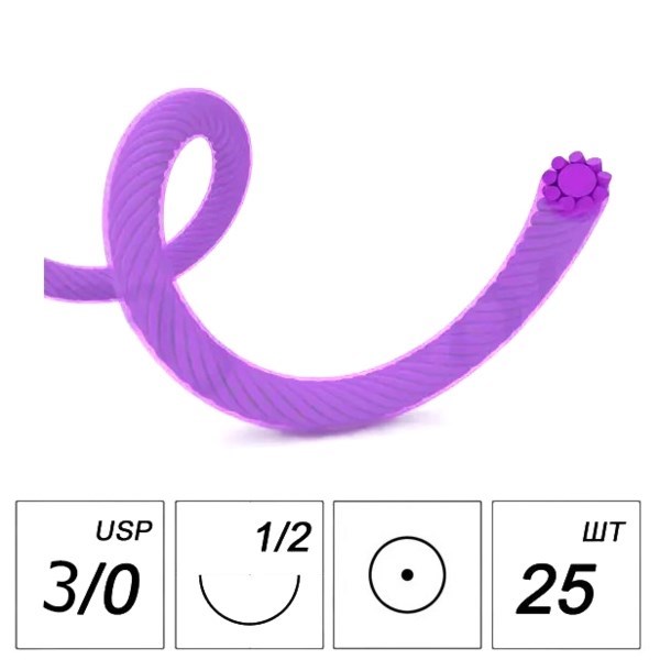 Лактисорб - плетеная нить 3/0 75 см (фиолетовая), игла колющая 20 мм 1/2, 25 шт