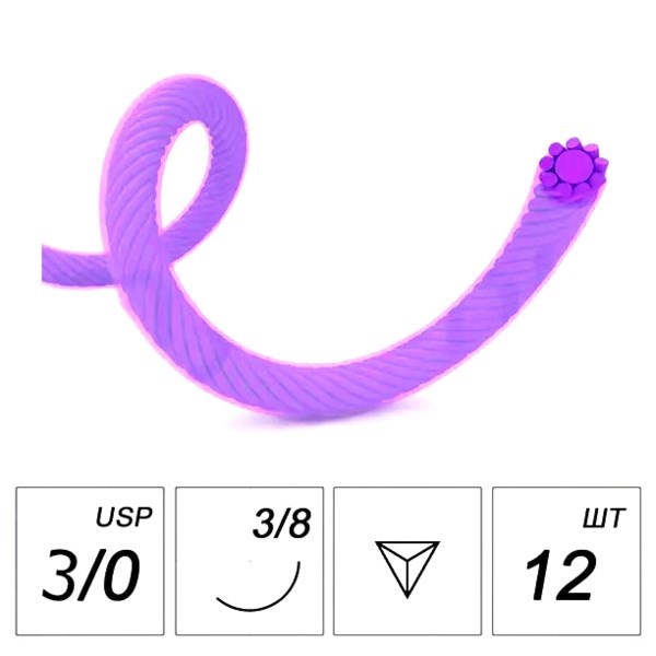 Лактисорб - плетеная нить 3/0 75 см (фиолетовая), игла обратно-режущая 16 мм 3/8, 12 шт