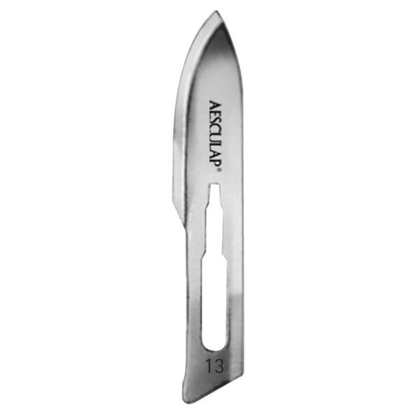 Скальпель №13, лезвие, стерильное, (Aesculap), Германия, BB513. Лезвия изготовлены из нержавеющей стали и предназначены для рассечения мягких тканей и сосудов в полости рта во время хирургических и пародонтологических операций. Они закрепляются на рукоятках перед использованием и удаляются после проведения манипуляций.