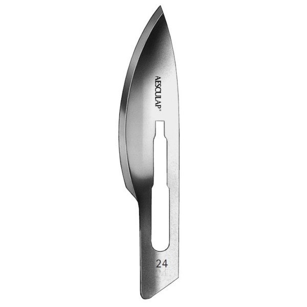 Скальпель №24, лезвие, стерильное, ББраун (B.Braun) Aesculap, Германия, BB524. Лезвия изготовлены из нержавеющей стали и предназначены для рассечения мягких тканей и сосудов в полости рта во время хирургических и пародонтологических операций. Они закрепляются на рукоятках перед использованием и удаляются после проведения манипуляций.
