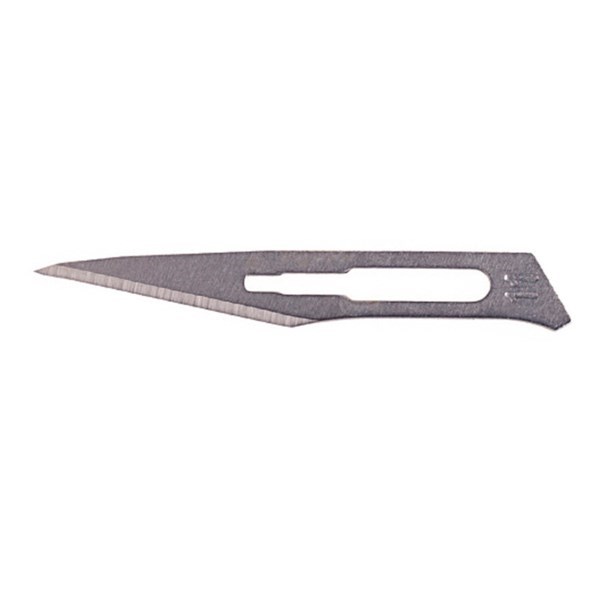 Продолговатое лезвие треугольной формы, заточенным по гипотенузе треугольника и имеющим прочный заостренный кончик, идеально подходящий для разрезов колющим движением. Применяется для выполнения разрезов при дренировании плевральной полости, вскрытия коронарных артерий, аорты и удаления кальцификатов с аортального или митрального клапана. Лезвия индивидуально упакованы в фольгу, ориентированы в одну сторону и уложены в транспортную тару. Совместимы с ручкой для скальпелей № 3. Углеродистая хирургическая сталь не вызывает побочных эффектов в организме человека и обладает биологической совместимостью. Стерилизовано гамма-излучением.