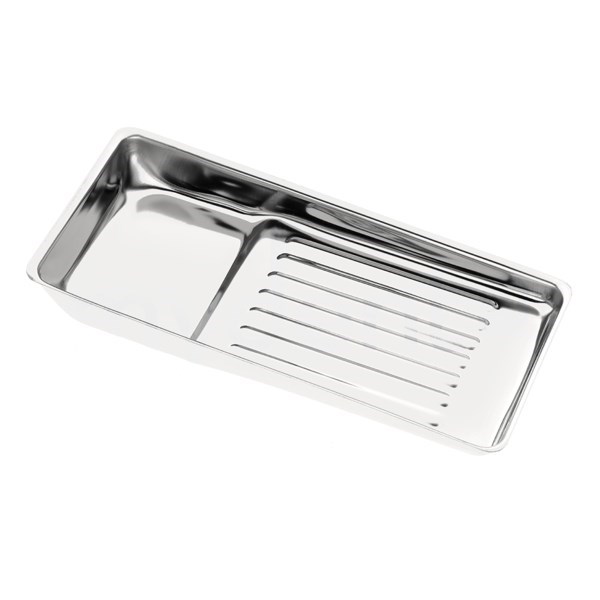 Основание прямоугольного стоматологического лотка разделено на две части. С одной стороны лоток имеет семь продольных выемок для упорядоченного хранения инструментов, с другой — емкость для сбора изделий медицинского назначения.