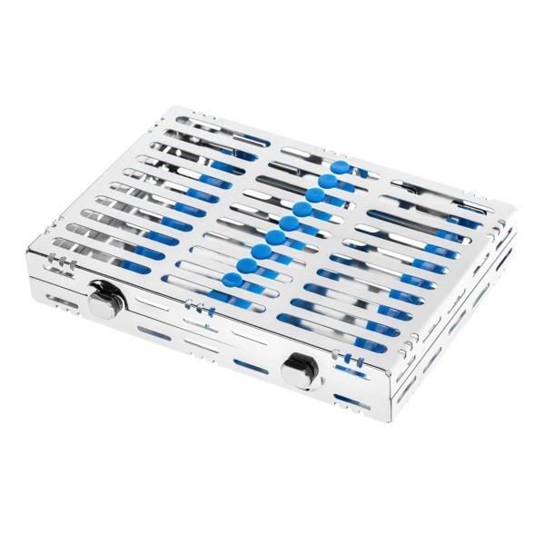 Лоток для хранения и стерилизации инструментов прямоугольный перформированный. Состояит из 2 частей, смыкаемых при закрывании и фиксируемых зажимными элементами на торцевой части. На продолжной оси лотка с внутренней стороны расположены ретенционные элементы, позволяющие удерживать инструменты в зафиксированном положении.