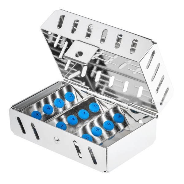 Стоматологический лоток представляет собой емкость прямоугольной формы с плотно прилегающей перфорированной крышкой и поддоном с силиконовыми держателями инструментов в количестве 12 штук. Угловое положение поддона с держателями позволяет стерилизовать боры не только под угловые, но и прямые наконечники. Благодаря специальной форме силиконовых фиксаторов инструменты не скользят в контейнере и надежно защищены от повреждений во время транспортировки.