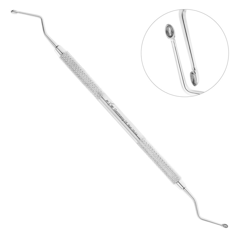 С обоих концов двустороннего инструмента расположены зеркально отраженные рабочие части шириной по 2 мм каждая. Концы рабочих частей представляют собой ложки овальных форм с острыми гранями.