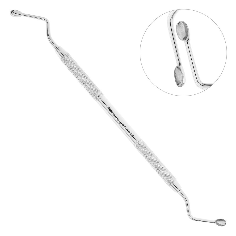 С обоих концов двустороннего инструмента расположены симметричные рабочие части шириной по 4 мм каждая. Концы рабочих частей представляют собой ложки овальных форм с острыми краями.