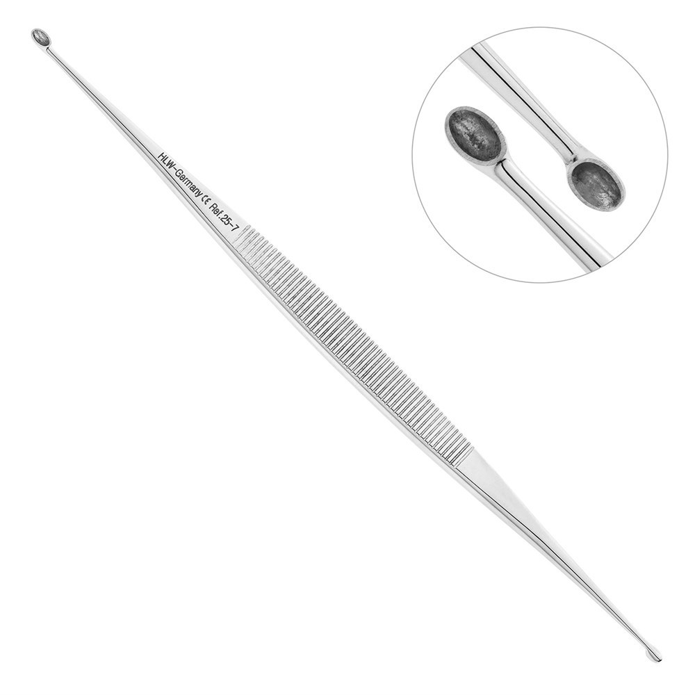 В хирургической стоматологии для удаления мелких фрагментов из лунки, а также кюретажа грануляционных тканей используется двусторонняя кюретажная ложка Williger торговой марки HLW Dental Instruments.