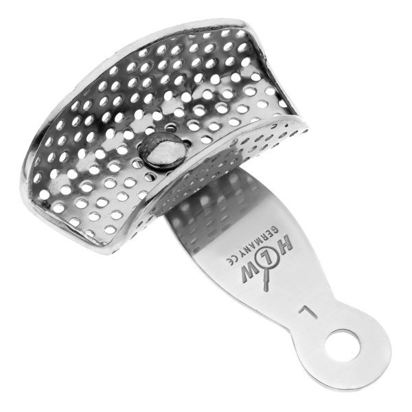 Ложка слепочная фрагментированная, HLW (Германия) предназначена для снятия оттисков (слепков) челюсти. Инструмент имеет ложе для оттискного материала, ограниченное бортами, и ручку для удержания и ориентировки ее в полости рта. Ложка перфорированная, она используется для снятия оттисков альгинатными, силиконовыми и другими оттискными материалами, не обладающими достаточной прилипаемостью, чтобы удержаться на ложке без отверстий.