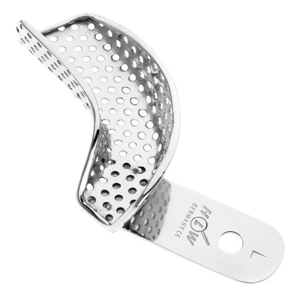 Ложка слепочная фрагментированная, HLW (Германия) предназначена для снятия оттисков (слепков) челюсти с левой стороны. Инструмент имеет ложе для оттискного материала, ограниченное бортами, и ручку для удержания и ориентировки ее в полости рта. Ложка перфорированная, она используется для снятия оттисков альгинатными, силиконовыми и другими оттискными материалами, не обладающими достаточной прилипаемостью, чтобы удержаться на ложке без отверстий.