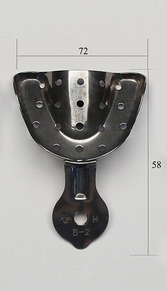 Ложка оттискная стоматологическая металлическая ЛОС-В-"ММИЗ № 2. Предназначена для изготовления временных назубных капп и шин из самотвердеющих пластмасс, силиконовых и альгинатных оттискных масс. Материал - нержавеющая сталь.