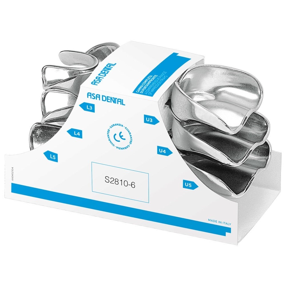 Ложка слепочная, набор 6 ложек, без перфорации с бортиком для отсутствующей передней группы зубов. Состав: 3 ложки верхних (малая, средняя, большая) и 3 ложки нижних (малая, средняя, большая).