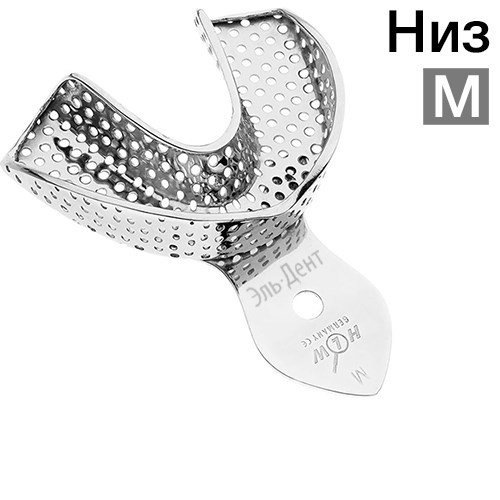 Ложка перфорированная, она используется для снятия оттисков альгинатными, силиконовыми и другими оттискными материалами, не обладающими достаточной прилипаемостью, чтобы удержаться на ложке без отверстий.