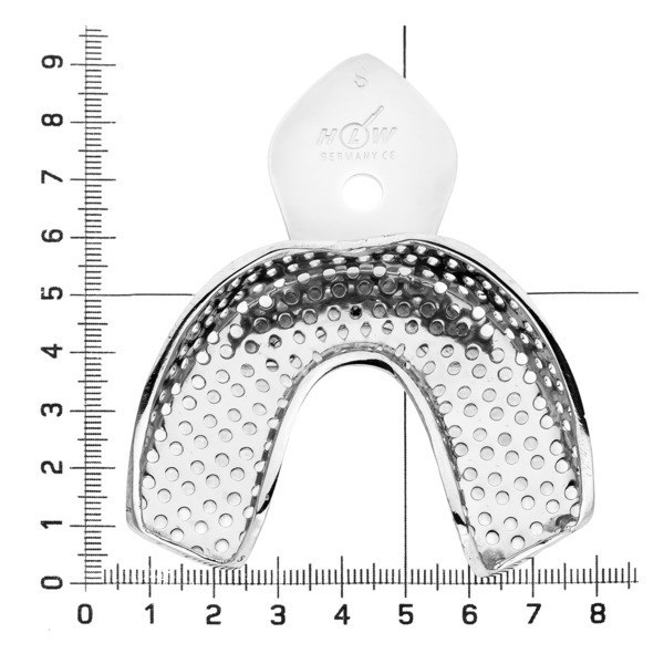 Ложка слепочная, HLW (Германия) предназначена для снятия оттисков (слепков) нижней челюсти. Инструмент имеет ложе для оттискного материала, ограниченное бортами, и ручку для удержания и ориентировки ее в полости рта. Ложка перфорированная, она используется для снятия оттисков альгинатными, силиконовыми и другими оттискными материалами, не обладающими достаточной прилипаемостью, чтобы удержаться на ложке без отверстий.