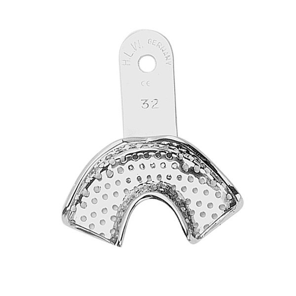 Ложка слепочная, HLW (Германия) предназначена для снятия оттисков (слепков) челюсти. Инструмент имеет ложе для оттискного материала, ограниченное бортами, и ручку для удержания и ориентировки ее в полости рта. Ложка перфорированная, она используется для снятия оттисков альгинатными, силиконовыми и другими оттискными материалами, не обладающими достаточной прилипаемостью, чтобы удержаться на ложке без отверстий.