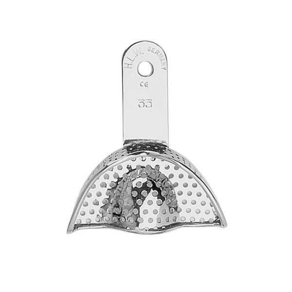 Ложка слепочная UK, HLW (Германия) предназначена для снятия оттисков (слепков) челюсти. Инструмент имеет ложе для оттискного материала, ограниченное бортами, и ручку для удержания и ориентировки ее в полости рта. Ложка перфорированная, она используется для снятия оттисков альгинатными, силиконовыми и другими оттискными материалами, не обладающими достаточной прилипаемостью, чтобы удержаться на ложке без отверстий.