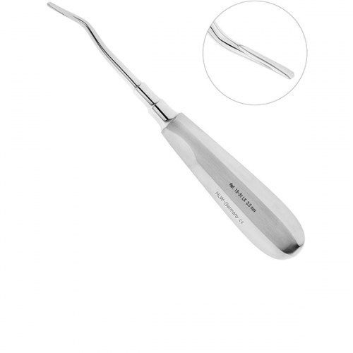 Люксатор HLW 13-31LX, двойной изгиб 3 мм, изготовлен компанией HLW Dental Instruments, произведенный для атравматичного удаления корней и зубов на нижней и верхней челюсти. Инструмент имеет изгиб по плоскости на конце соединительного стержня для обеспечения удобного доступа в периодонтальную щель удаляемого зуба. При помощи узкой, острой, с небольшим изгибом щечки люксатора можно эффективно выполнять поддевающие движения при экстракции зуба или корня с минимальной травмой окружающих мягких тканей. Удлиненный соединительный стержень и рабочая часть инструмента позволяют легко и быстро осуществить самые сложные удаления. Полая стандартная ручка люксатора имеет эргономичную форму с гранями на поверхности и выемками под пальцы руки. Такая конструкция обеспечивает надежный захват ручки и снижает нагрузку на руку.