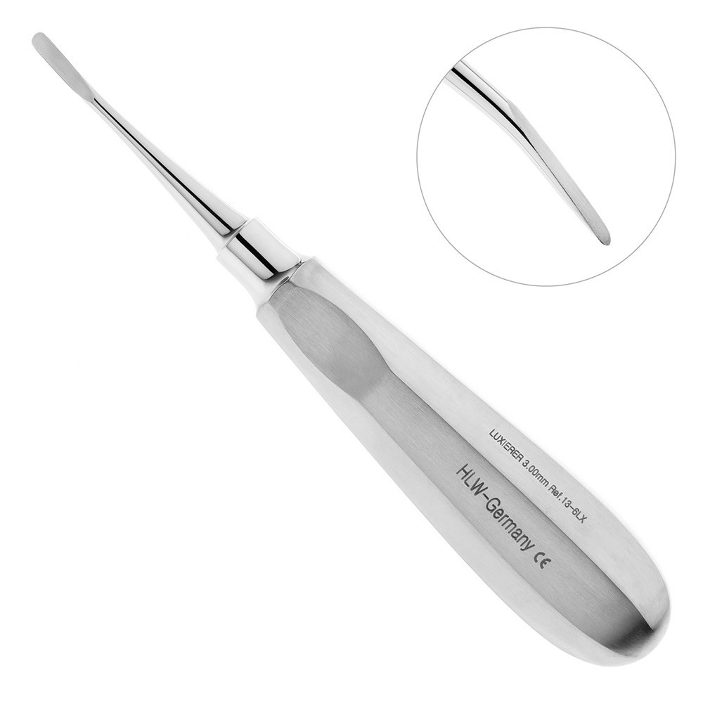 Рабочая часть инструмента очень тонкая, острая и закругленная на конце. Между соединительным стержнем и щечкой люксатора расположен изгиб по плоскости. Такое строение позволяет ввести люксатор очень глубоко (около 2/3 от длины корня зуба) в периодонтальную связку и безопасно осуществить удаление корня или зуба в ротовой полости.