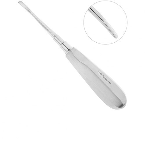 Люксатор HLW 13-26LX изогнутый 5 мм, предназначен для атравматичного удаления корней и зубов на нижней и верхней челюсти. Инструмент произведен немецкой компанией HLW Dental Instruments. Люксатор в основании рабочей части имеет одиночный изгиб по плоскости, благодаря которому инструмент можно глубоко ввести аксиально между корнем зуба и костной тканью лунки. Очень тонкая острая рабочая часть инструмента позволяет разрезать периодонтальную связку. При этом удаление происходит намного безопаснее, чем при использовании обычных хирургических стоматологических инструментов. Стандартная ручка инструмента легкая, имеет грани. Проводить операцию по удалению корней или зубов люксатором с такой ручкой очень удобно.