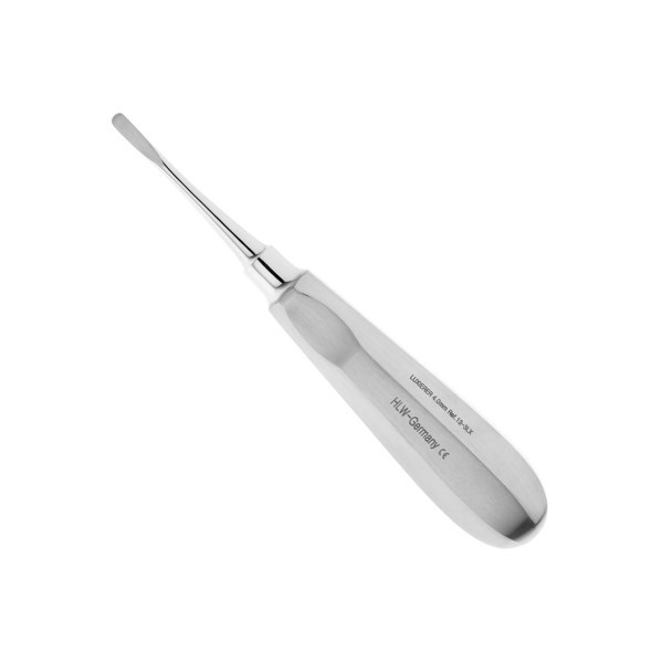 Прямой люксатор, имеющий лезвие шириной не менее 4 мм, закруглённое на конце, полая ручка имеет эргономичную форму с выемками под пальцы для наилучшего захвата и удержания инструмента.