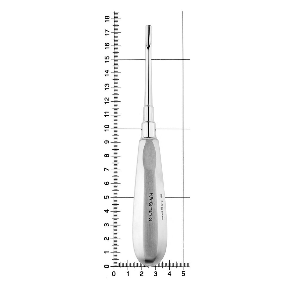 Для атравматичного удаления корней и зубов на нижней и верхней челюсти немецкой компанией HLW Dental Instruments изготовлен удлиненный люксатор с шириной рабочей части 5 мм.