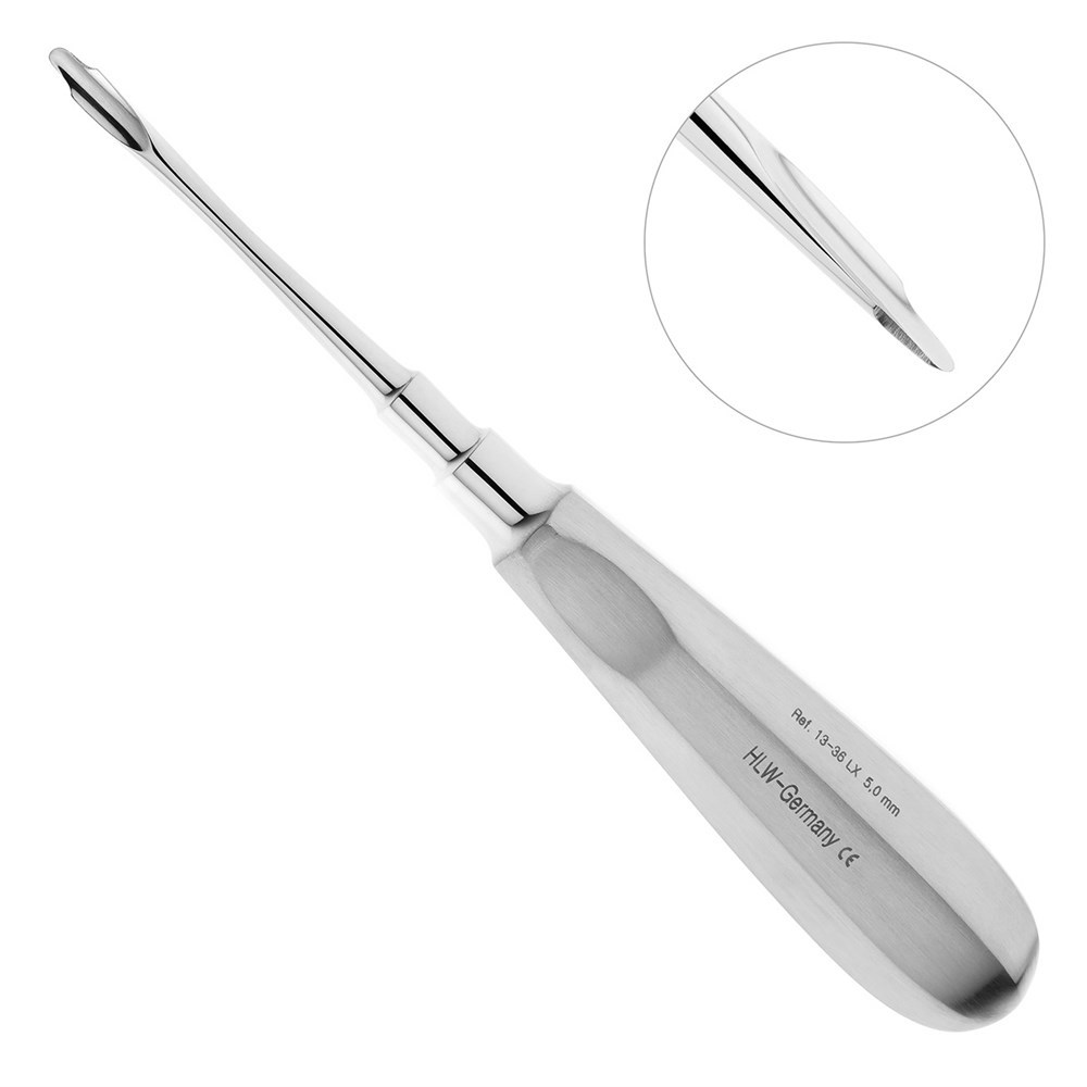 Компанией HLW Dental Instruments для атравматичного удаления корней и зубов на нижней и верхней челюсти изготовлен удлиненный люксатор с шириной рабочей части 5 мм.