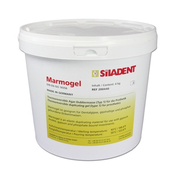 Эластичный дублирующий гель Marmogel зеленого цвета используется для отливки моделей из гипса и паковочных материалов на основе фосфата. Marmogel – это высококачественный гидроколлоидный материал, изготовлен из натурального сырья и стабилизационных субстанций.