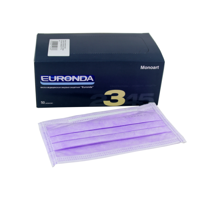 Маска одноразовая медицинская "Euronda" 3-х слойная на резинке, цвет лиловый (50 шт. в уп.)