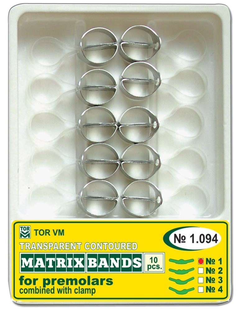 Матрицы 1.094 (форма 4) контурные лавсановые с фиксирующим устройством. Для премоляров с левым выступом. Позволяют проводить реставрацию зубов светотверждаемыми материалами без использования матрицержателя. Фиксирующее устройство представляет собой алюминевое кольцо, сжатие которого в горизонтальной плоскости обеспечивает фиксацию матрицы вокруг зуба. Упаковка 10 шт.