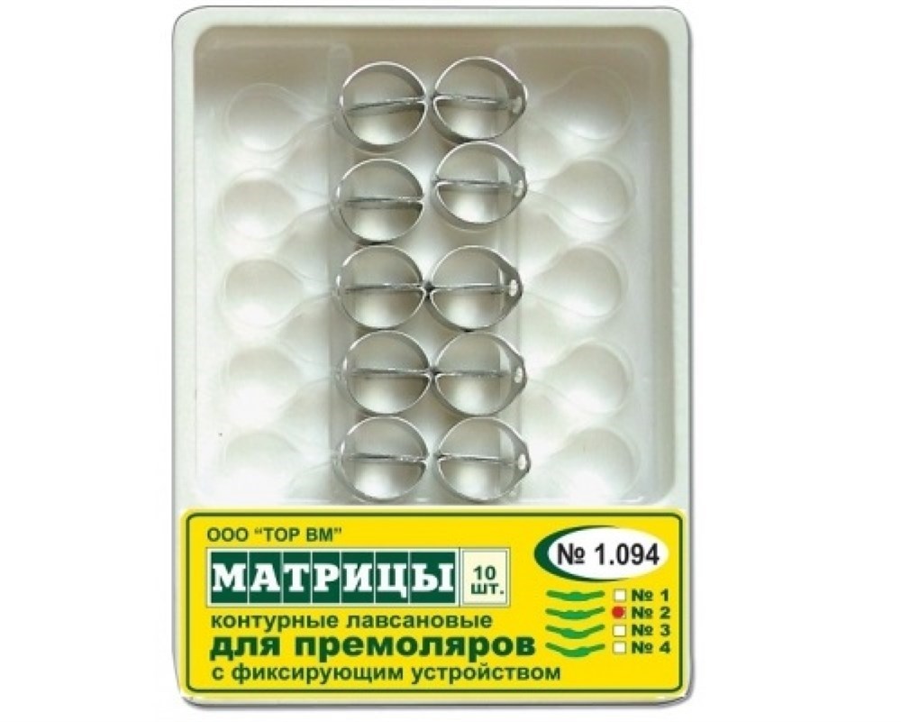 Матрицы 1.094 (форма 1) контурные лавсановые с фиксирующим устройством. Для премоляров с центральным выступом. Позволяют проводить реставрацию зубов светотверждаемыми материалами без использования матрицержателя. Фиксирующее устройство представляет собой алюминевое кольцо, сжатие которого в горизонтальной плоскости обеспечивает фиксацию матрицы вокруг зуба. Упаковка 10 шт.