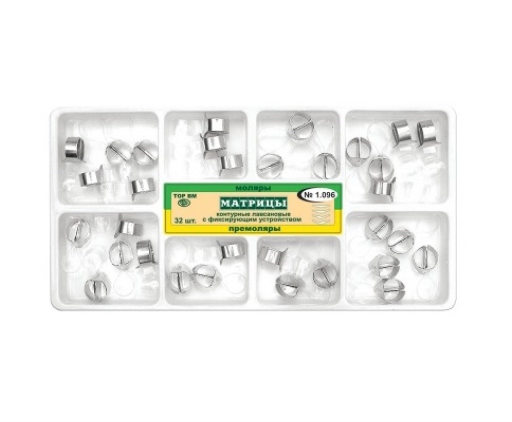 Матрицы 1.096 контурные лавсановые с фиксирующим устройством (8 форм) набор (32 шт) (для премоляров: форма1(центральный выступ)-3шт, форма2 (два центральных выступа)-3 шт,форма 3 (левый выступ)-5 шт, форма 4 (правый выступ)-5 шт, для моляров: форма1(центральный выступ)-3 шт, форма 2(два центральных выступа)-3 шт, форма 3 (левый выступ)-5 шт, форма 4 (правый выступ)-5 шт. 32 шт (ТОР ВМ)