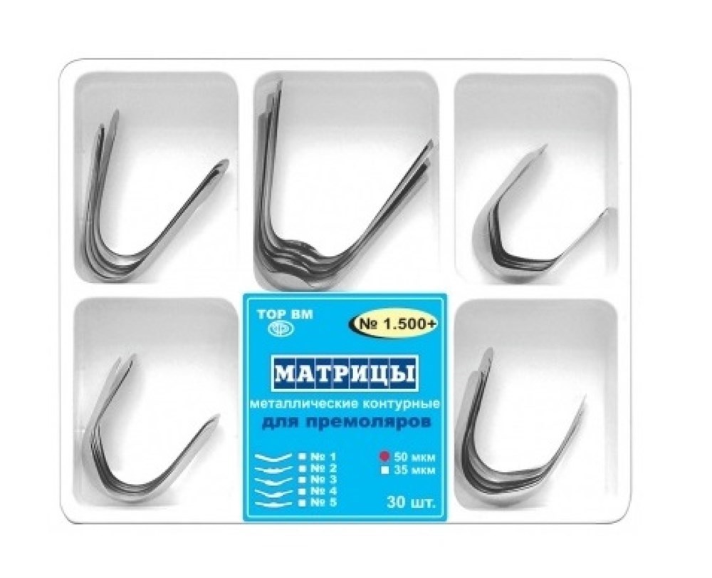 Матрицы металлические, контурные для премоляров 5-ти форм "ТОР ВМ"Матрицы металлические контурные, для премоляров 5-ти форм, 1.500+, ТОР ВМ (Россия)