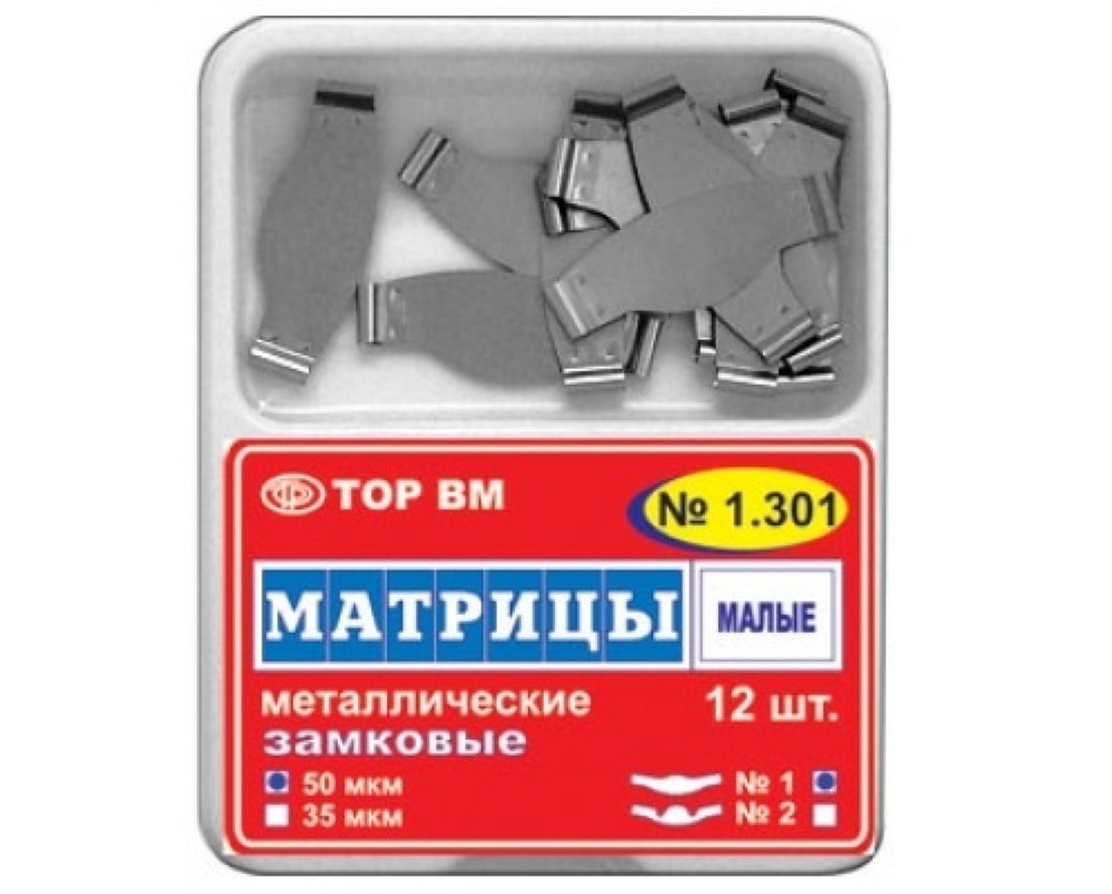 Матрицы металлические с замковым фиксирующим устройством выпускаются плоские и контурные. Края матриц выполнены в виде цилиндрических трубочек, в которые вставляют ножки колец № 1.033, № 1.033с, № 1.099А(1,2мм) или фиксаторов замыкающих № 1.003 или № 1.005. Матрицы изготавливают из специальной коррозионностойкой стали..