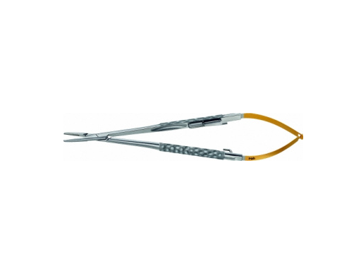 Микроиглодержатель, DUROGRIP, длина 170 мм, для нитей 4/0-6/0, BM003R, B.Braun (Aesculap, Германия) выполнен с твердосплавными вставками на основе кобальта, рукоятки плоские разъемные с поперечными насечками, кольца позолоченные, замок кремальера. Специальные поверхность рукояток с выемками препятствует выскальзыванию инструмента. Длина бранш 14,4 мм, рабочая длина бранш 10 мм, ширина бранш 2 мм, имеются также насечки.