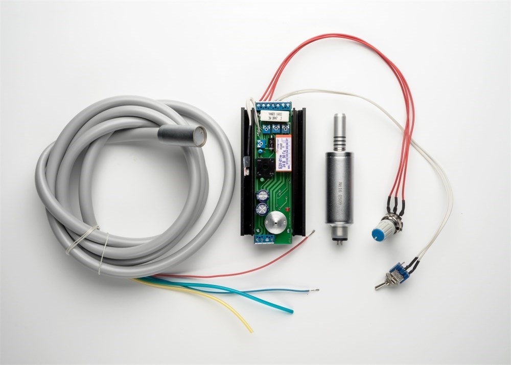 БЭУ-01.07 24В с микроэлектродвигателем ДП-5-02Комплект для монтажа в стоматологическую установку (~24 В, БЭУ-01 24В, тумблер- реверс, потенциометр для регулировки частоты вращения, блок питания фиброоптики БПФ-01, шланг для подключения ДП-5-02)