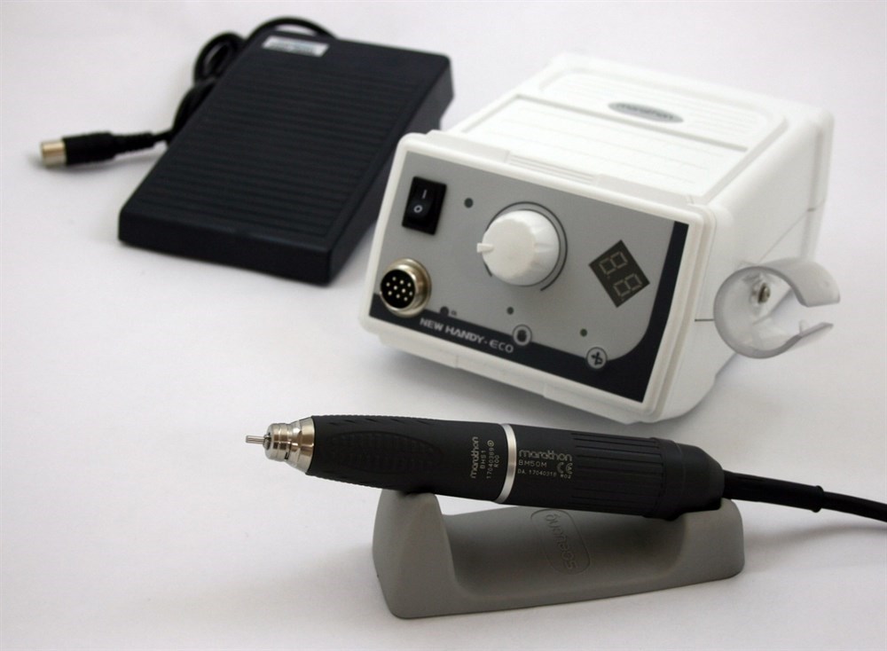 Микромотор HANDY ECO предназначен для обработки широкого спектра материалов, применяемых в зуботехнических лабораториях. Блок управления имеет конструктивную особенность, и может располагаться на рабочем столе как в стандартном положении, так и на боку, что экономит рабочее пространство на поверхности стола. Блок управления HANDY ECO имеет жидкокристаллический дисплей, на котором отображаются показания скорости вращения инструмента. Управление микромотором осуществляется сенсорными кнопками.