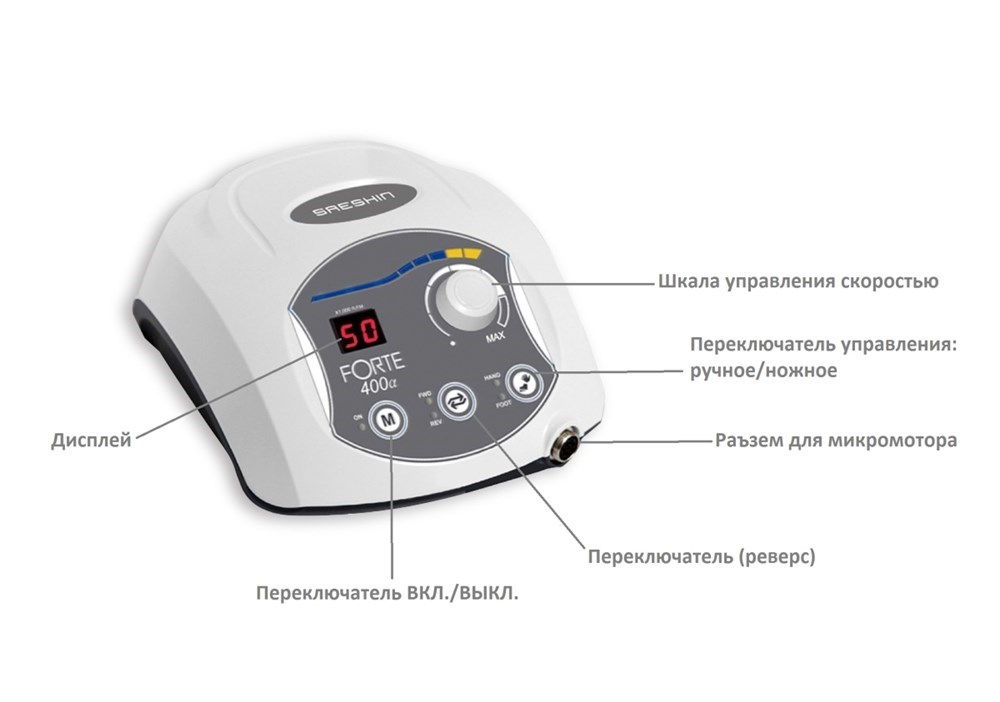 Блок управления Forte 400a: Цифровая индикация, система самодиагностики с выводом кодов ошибок на дисплей. Плавная регулировка скорости вращения наконечника, функция распознавания нагрузки на наконечник, боковая педаль-клавиша, реверс мотора, ручное/ножное/коленное управление. Стабильный крутящий момент при любом диапазоне скоростей. Горизонтальное исполнение блока управления (настольный).