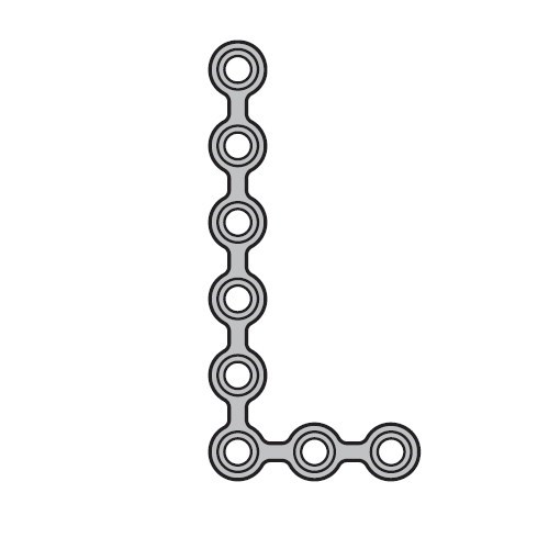 Микропластина Конмет толщиной 0,6 мм изготовлена из титана, имеет L-образную форму и 8 отверстий. Применяется для черепно-челюстно-лицевого остеосинтеза и костной пластики.