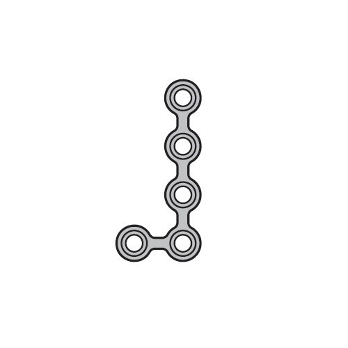 Короткая микропластина толщиной 0,6 мм изготовлена из титана, имеет L-образную форму и 5 отверстий. Применяется для черепно-челюстно-лицевого остеосинтеза и костной пластики.