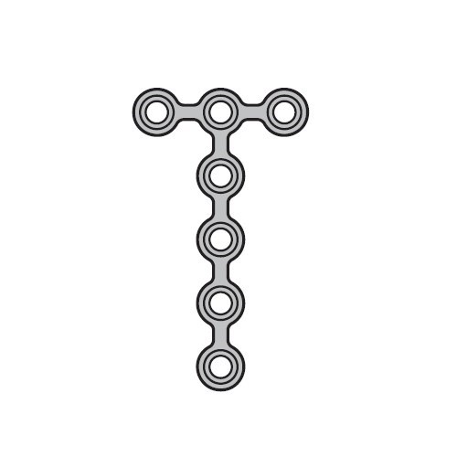 Микропластина длинная от компании Конмет толщиной 0,6 мм изготовлена из титана, имеет T-образную форму и 7 отверстий. Применяется для черепно-челюстно-лицевого остеосинтеза и костной пластики.