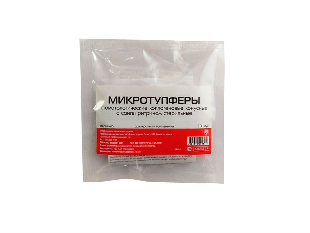 Особенности: Микротупферы стоматологические коллагеновые конусные с сангвиритрином 10 штук, каждый в отдельной стерильной упаковке, помещенной в картонную пачку.