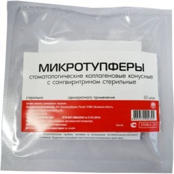 Микротупферы стоматологические коллагеновые конусные с сангвиритрином 10 штук, каждый в отдельной стерильной упаковке, помещенной в картонную пачку.