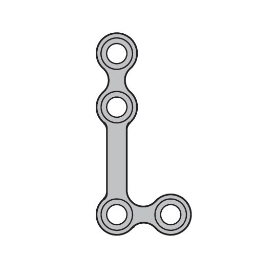 Мини-пластина Конмет толщиной 1 мм изготовлена из титана, имеет L-образную форму и 4 отверстия. Применяется для черепно-челюстно-лицевого остеосинтеза и костной пластики.