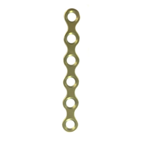 Мини-пластина Конмет толщиной 0,6 мм изготовлена из титана, имеет прямую форму и 6 отверстий. Применяется для черепно-челюстно-лицевого остеосинтеза и костной пластики.